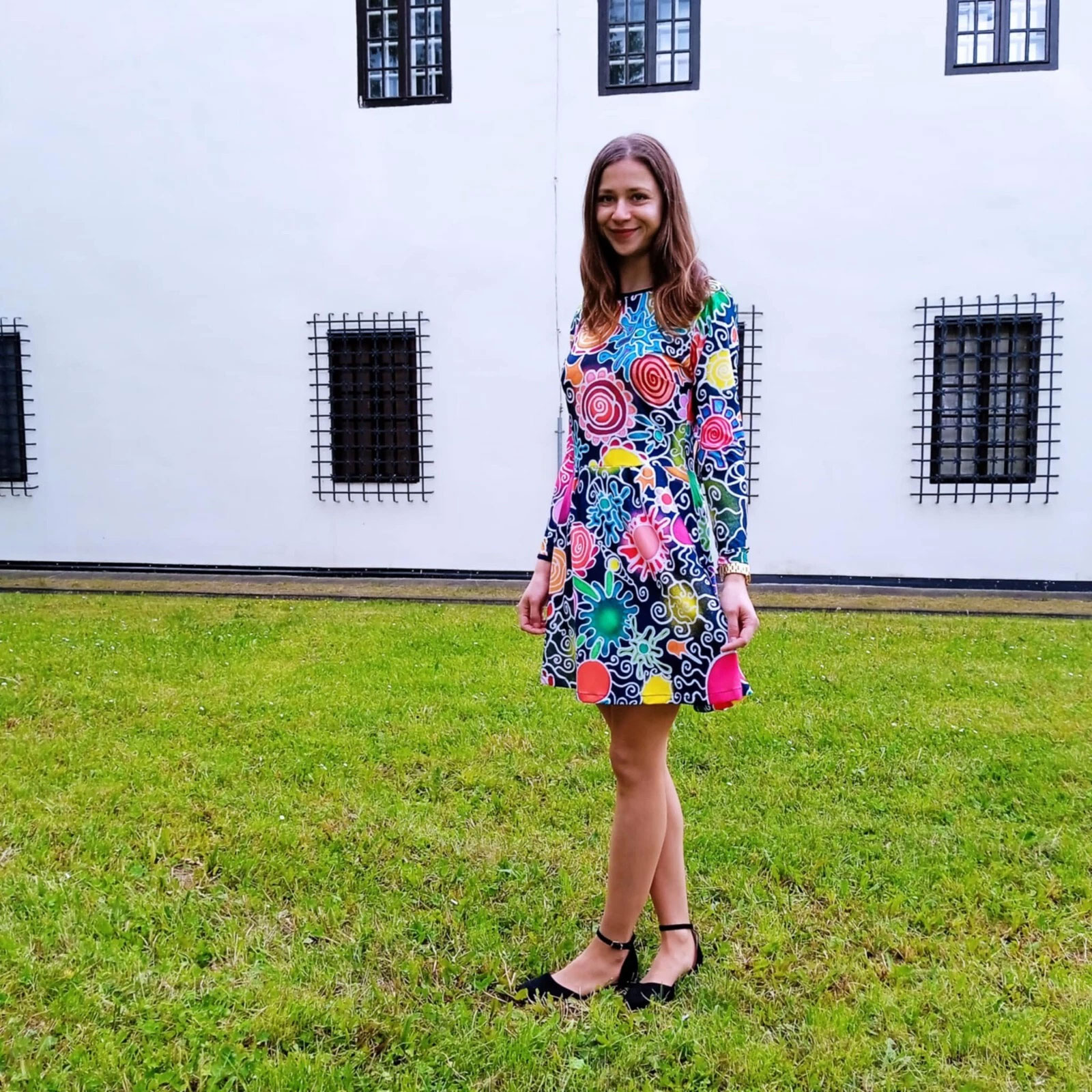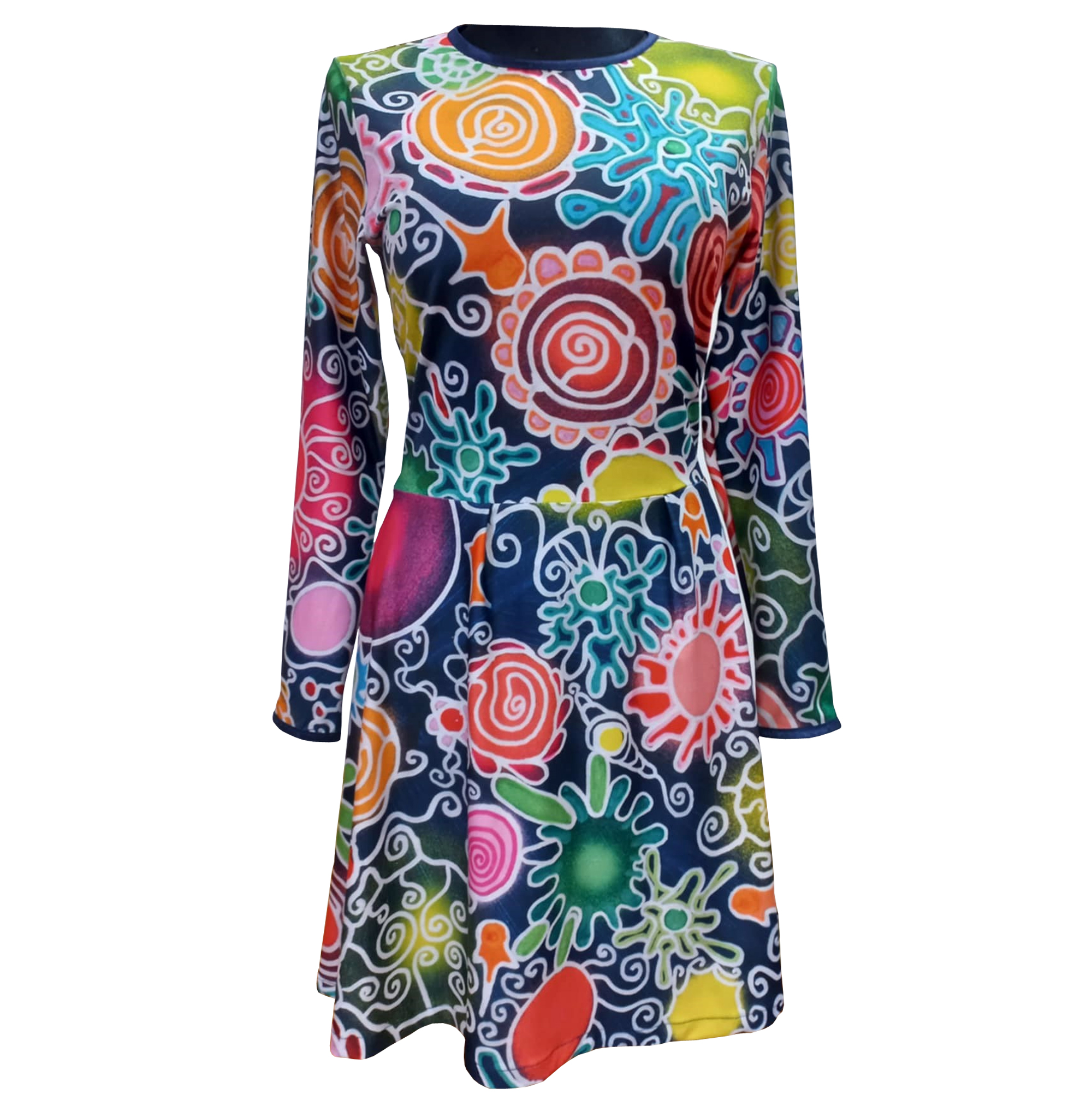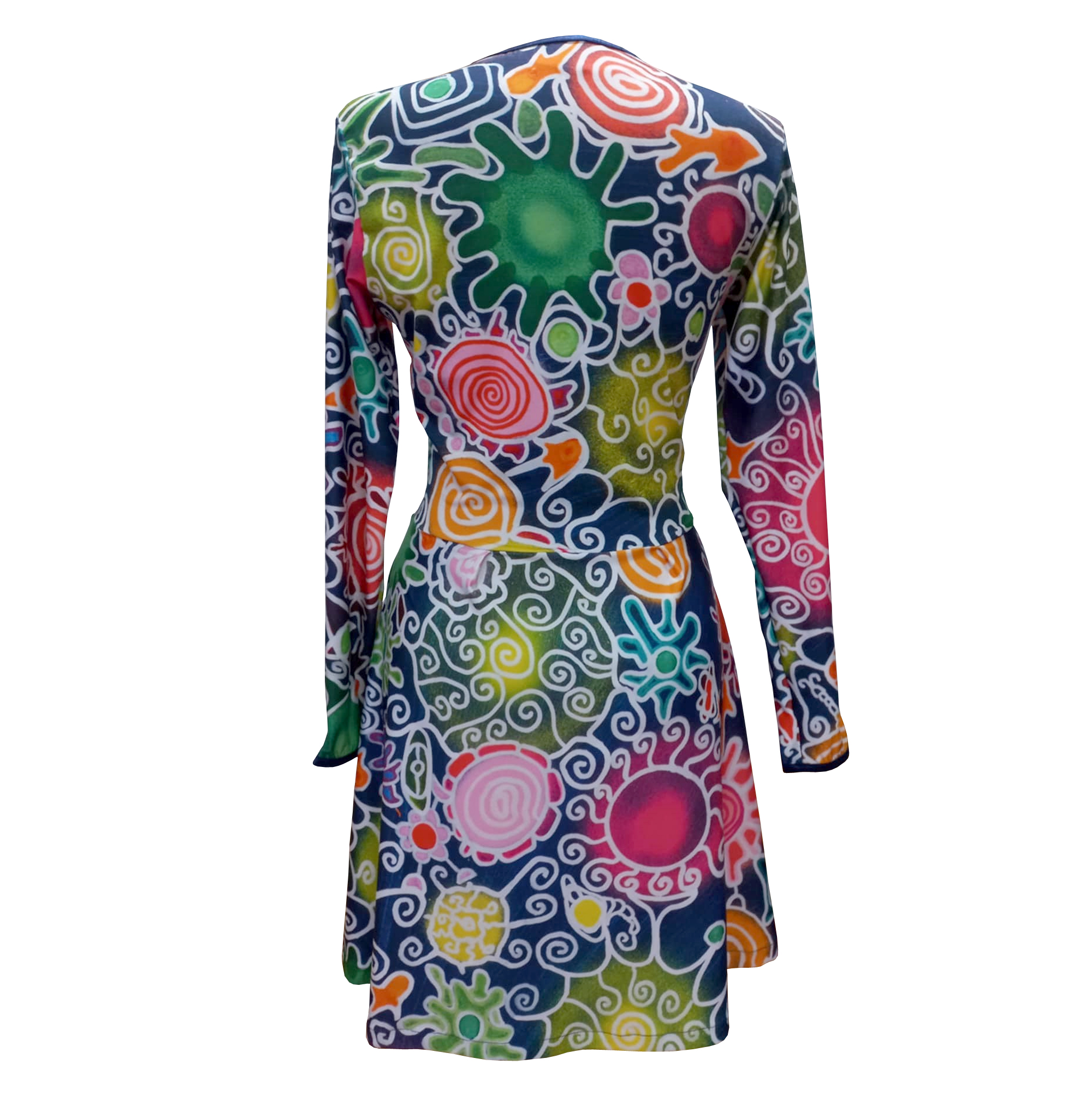 Zažite vášeň a originalitu v šatách z nekrčivého úpletu s rukávmi a krátkou sukňou. Ich vzor vám dodá energiu a farby, ktoré tancujú, vytvoria váš vlastný svet fantázie.