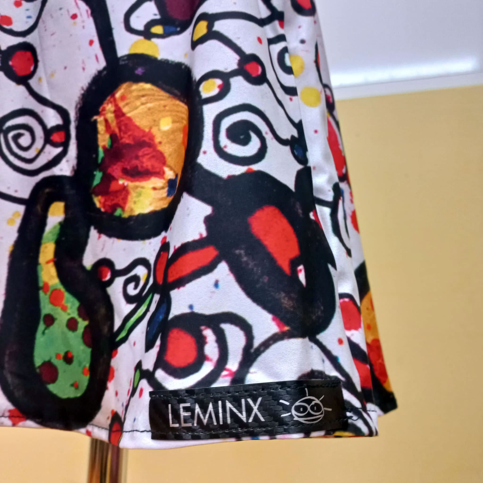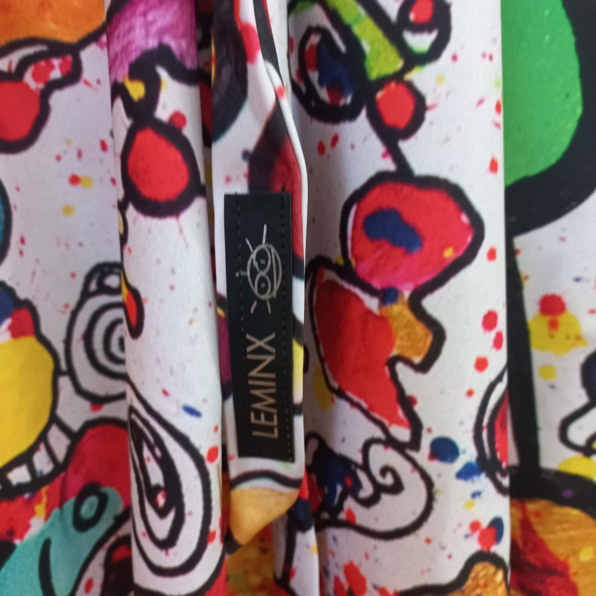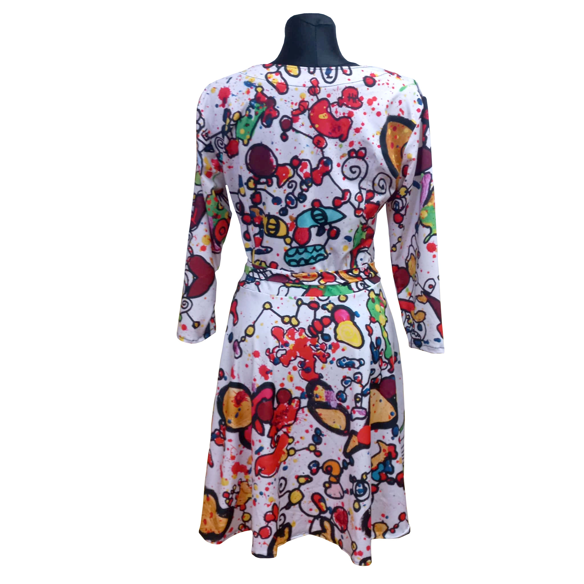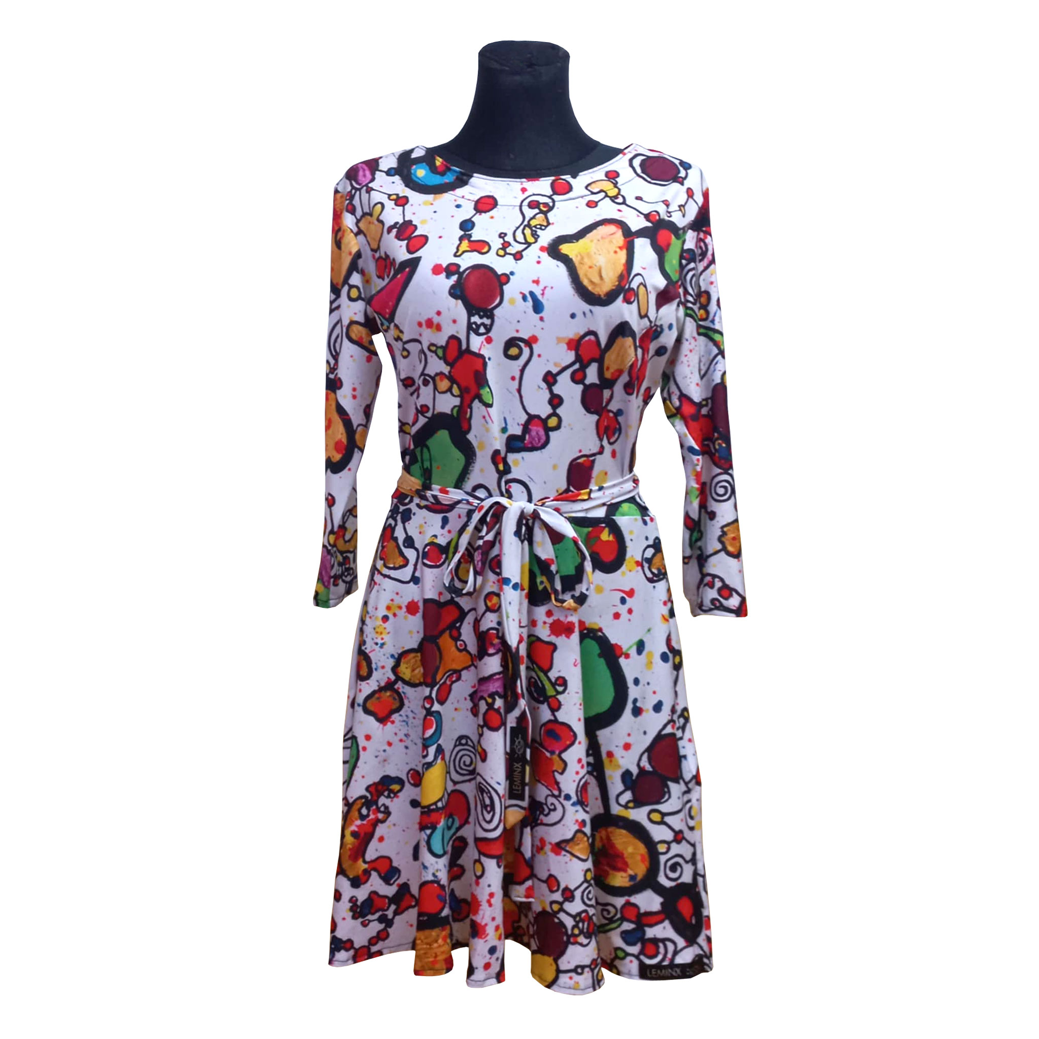 Zažite vášeň a originalitu v šatách z nekrčivého úpletu s dlhým rukávom a krátkou sukňou. Ich vzor vám dodá energiu a farby, ktoré tancujú, vytvoria váš vlastný svet fantázie.