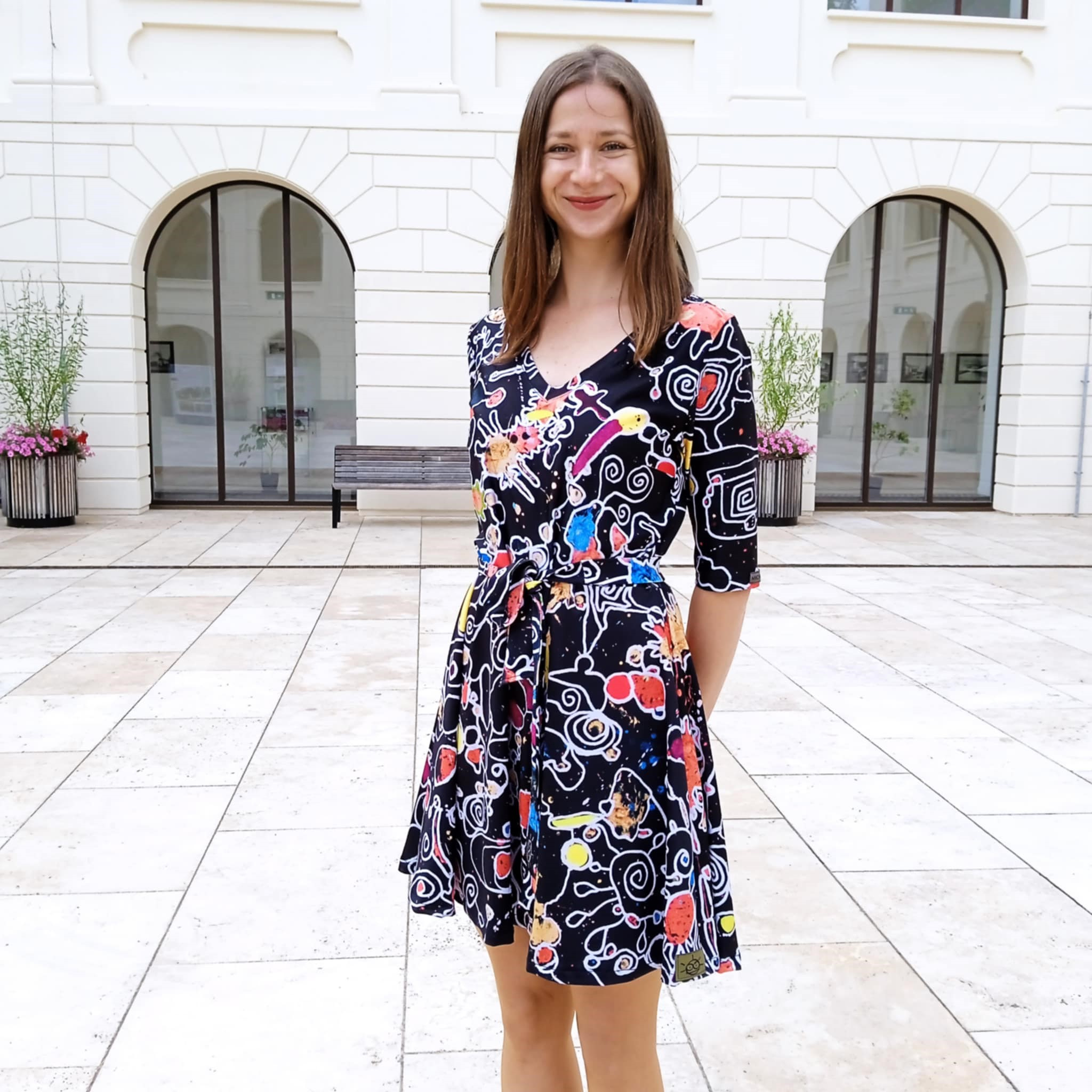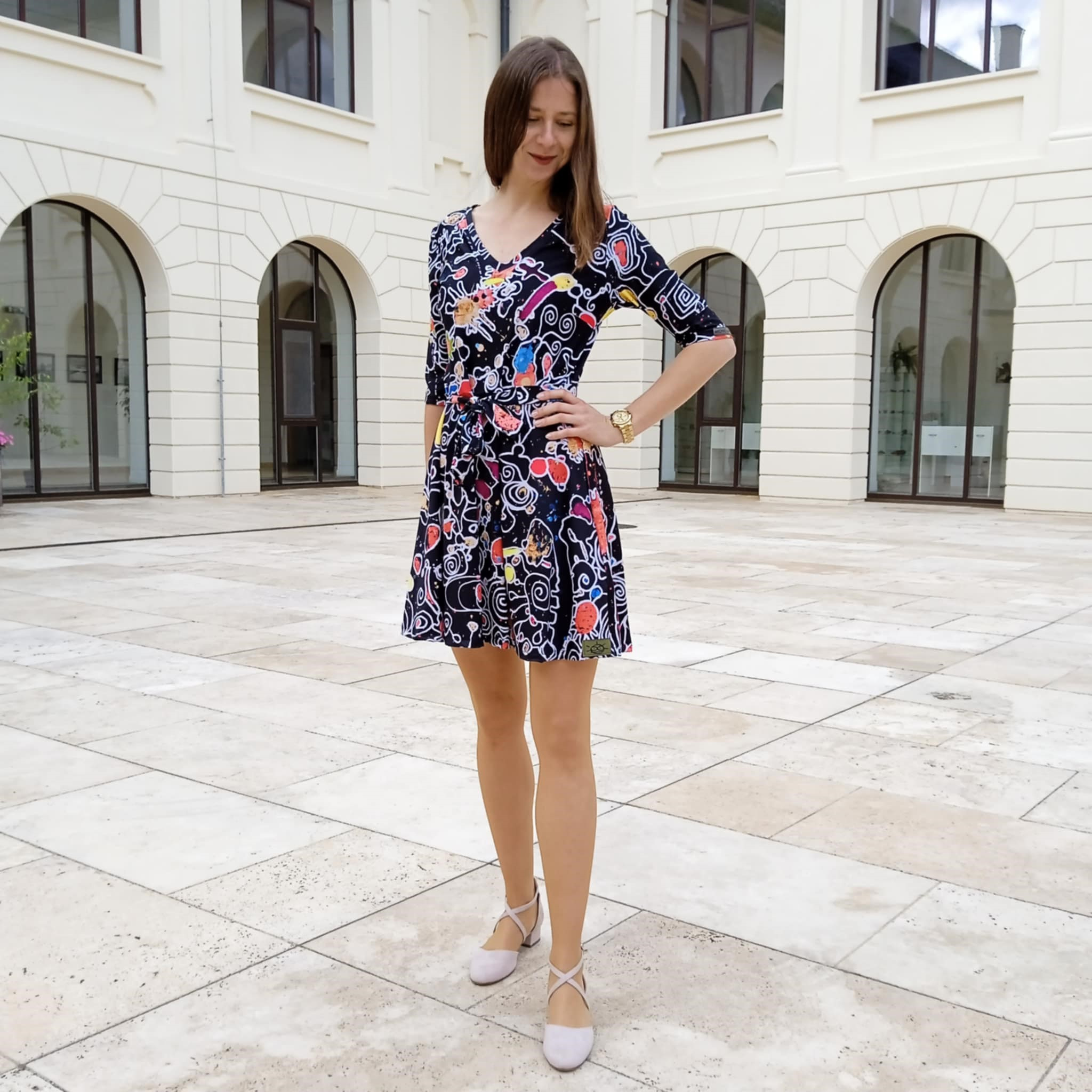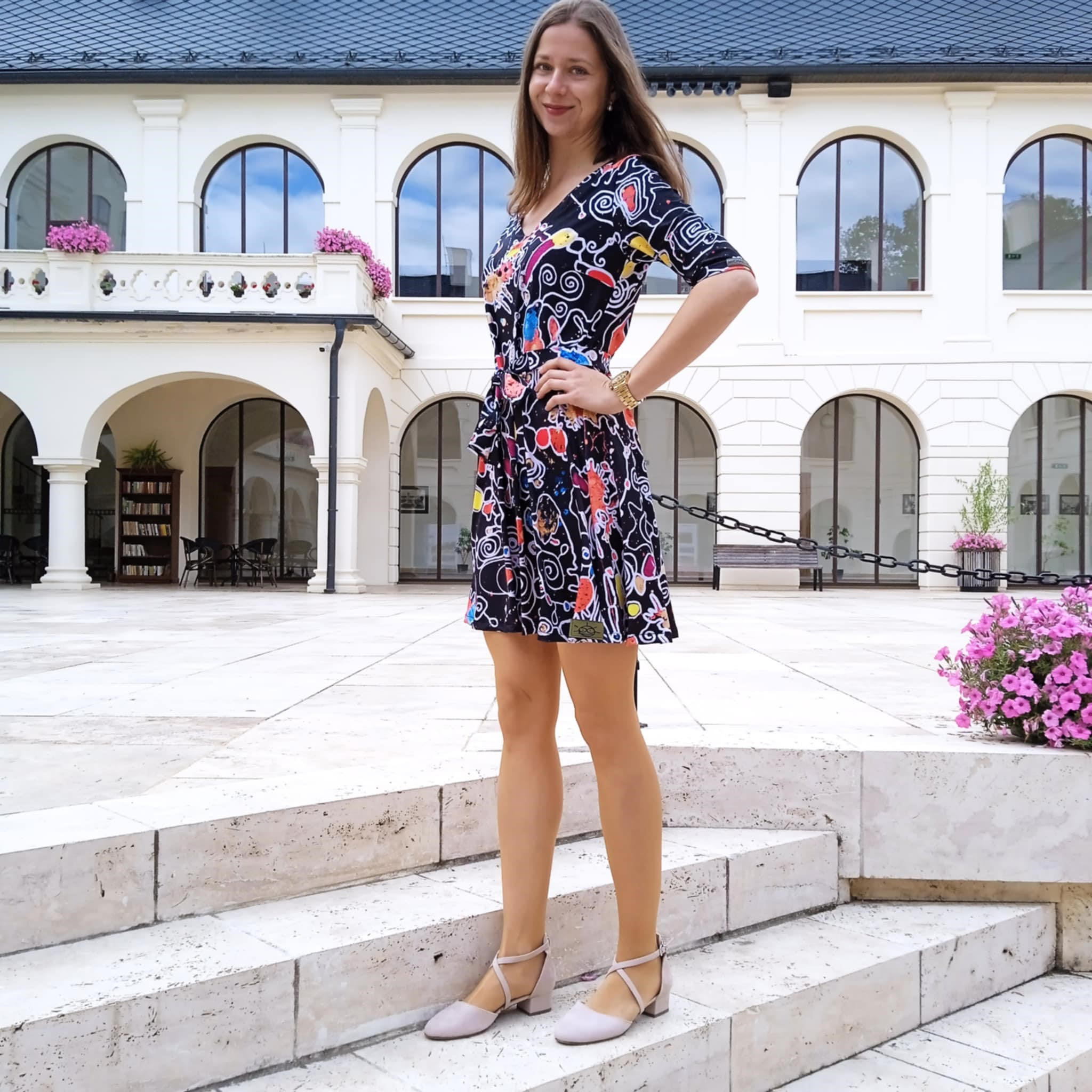 Zažite vášeň a originalitu v šatách z nekrčivého úpletu s dlhým rukávom a krátkou sukňou. Ich vzor vám dodá energiu a farby, ktoré tancujú, vytvoria váš vlastný svet fantázie.