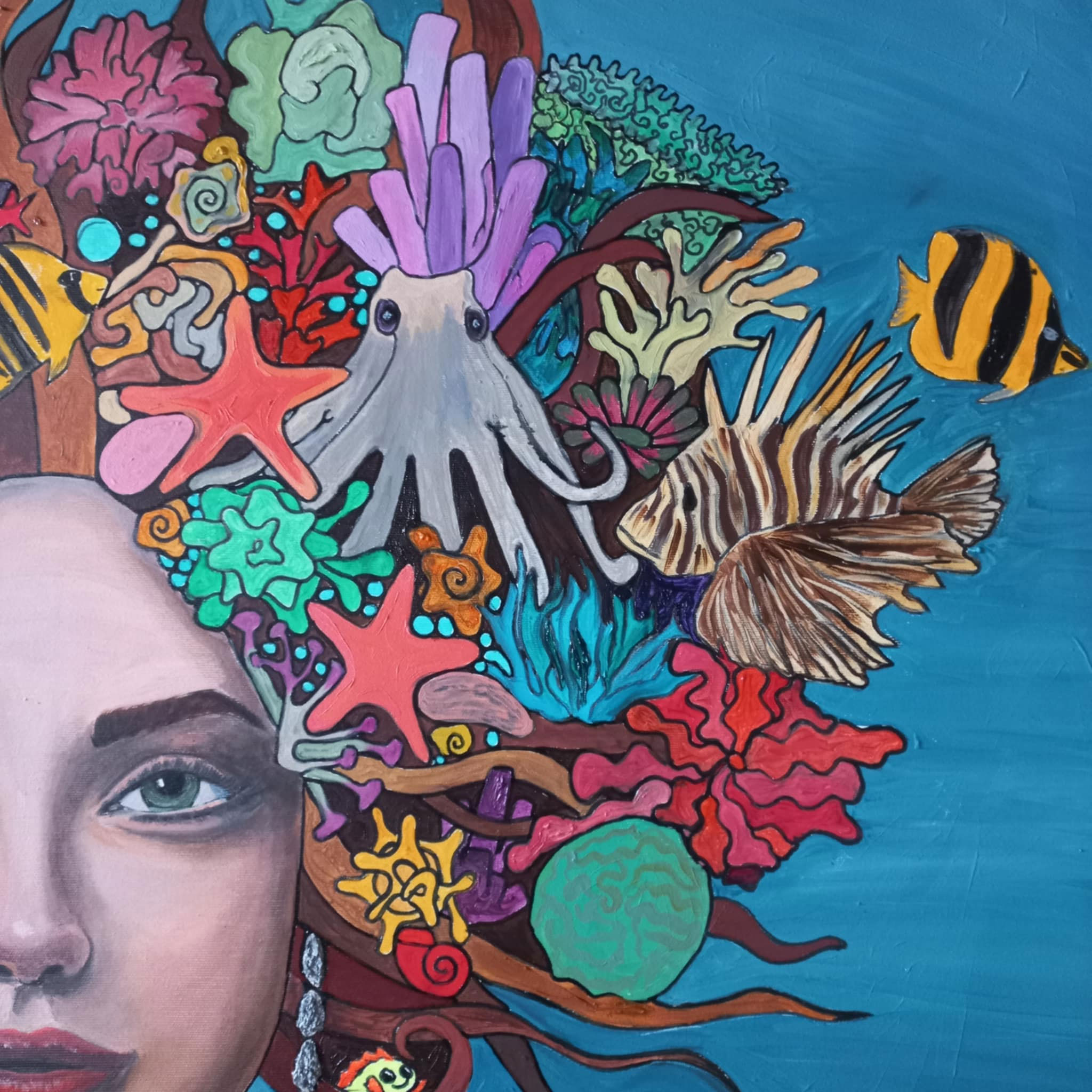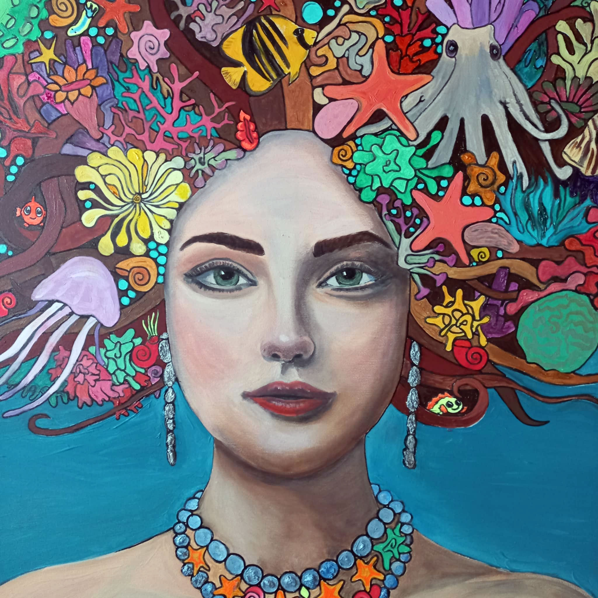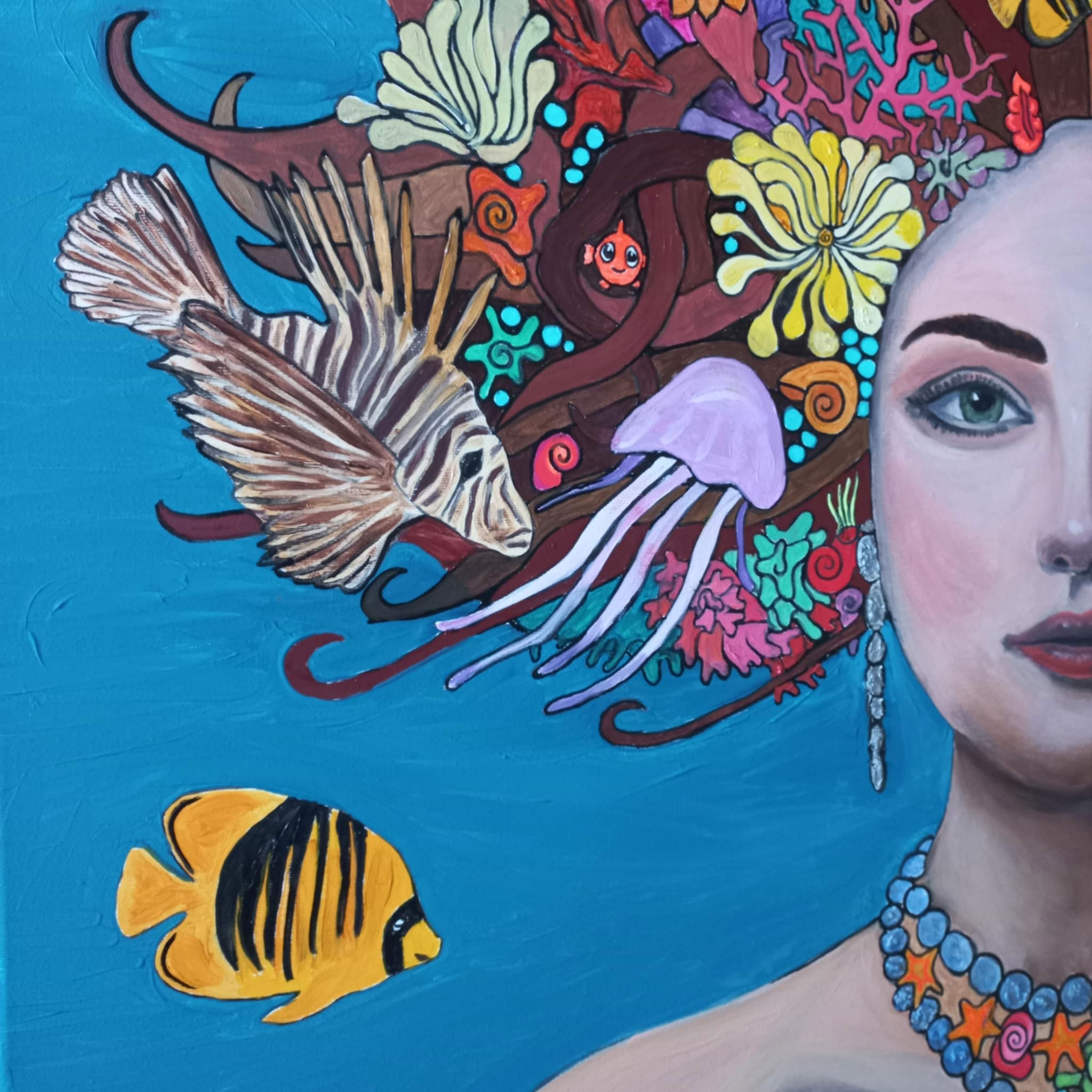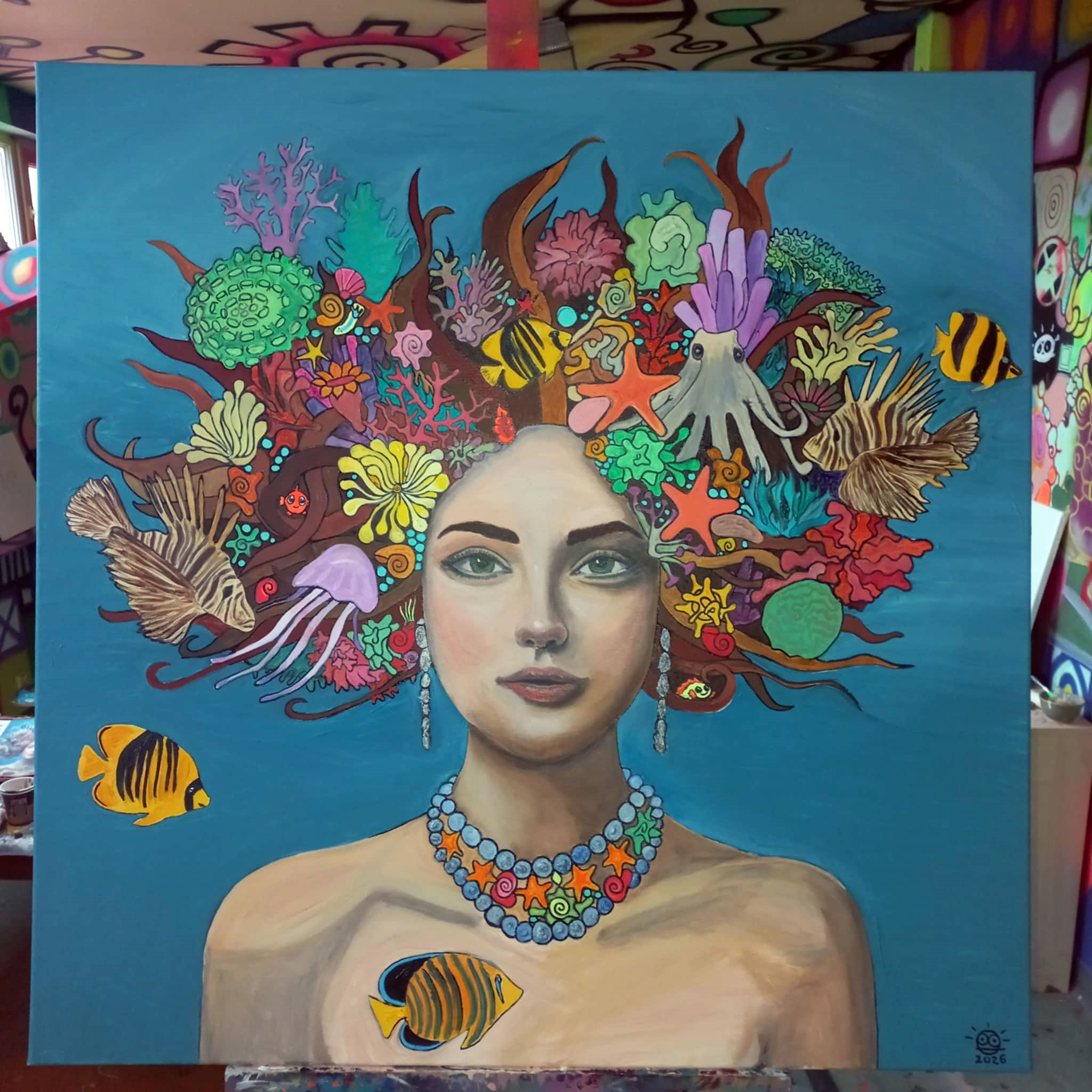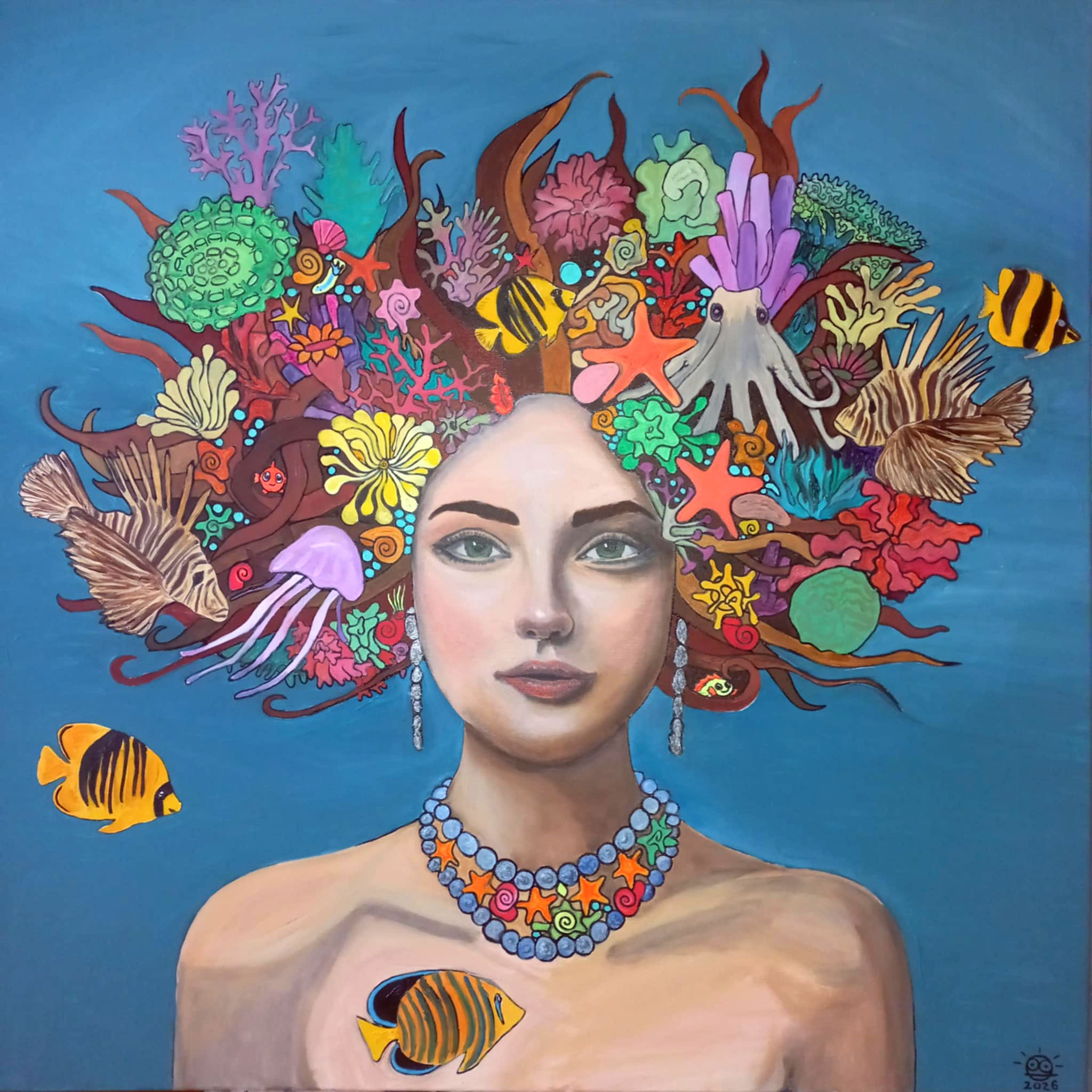 Olejomaľba na plátne (100 x 100 cm) predstavuje podmanivý portrét ženy, ktorej tvár vyžaruje hlboký vnútorný pokoj a majestátnosť. Jej priamy pohľad a jemné črty tváre sú v kontraste s divokou koralovou korunou vo vlasoch. V spleti koralov pulzuje život – od dominantných perutínov cez chobotnicu až po žiarivé pomece a drobné nahožiabre plže. Každý detail, vrátane morských hviezdic a lastúr vpletených do jej „hrivy“, potvrdzuje jej rolu živého útočiska. Pozadie v upokojujúcom odtieni Deep Blue vťahuje diváka do meditatívneho ticha. Vďaka precíznej technike a unikátnej téme je dielo nielen estetickou dominantou interiéru, ale aj cennou investíciou do súčasného umenia. Dielo oslavuje krehkú krásu biodiverzity.
